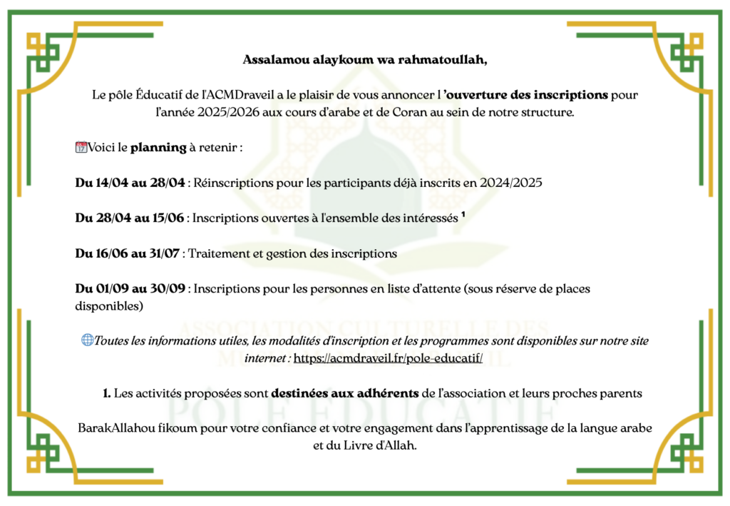 Toutes les informations utiles, les modalités d’inscription et les programmes sont disponibles sur notre site internet : https://acmdraveil.fr/pole-educatif/